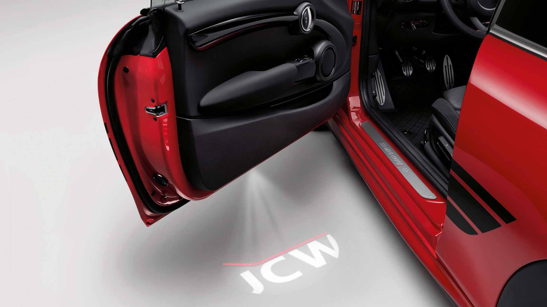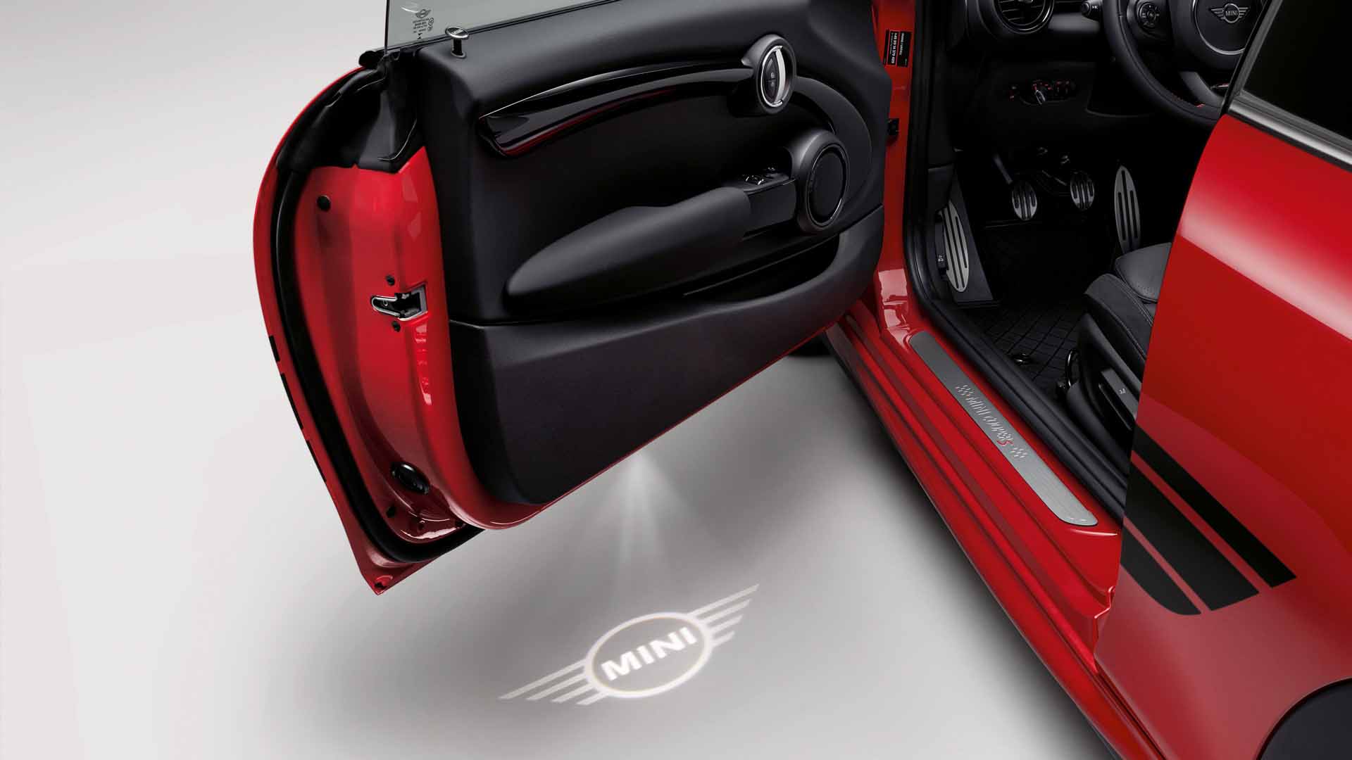 Novi LED-projektorji na vratih MINI z izboljšano kakovostjo projekcije in nadpovprečno življenjsko dobo poskrbijo, da je vstop in izstop iz vozila edinstveno doživetje. Samodejno se aktivirajo, takoj ko odprete vrata, in osvetlijo območje vstopa na povsem individualen način s projiciranjem slike na tla ob vozilu. Voznik lahko sam izbere sliko, ki se projicira s pomočjo izmenljivih diapozitivov, in izbira med logotipom MINI in motivom JCW.